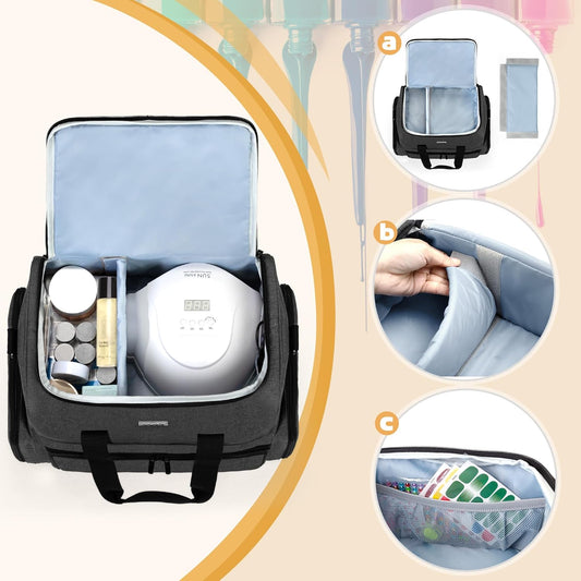 BAFASO Stylish Double Layer Nail Polish Organizer - Holds 80 Bottles and UV Nail Lamp with Removable Pouches & Manicure Tools Storage - Sleek Black Design